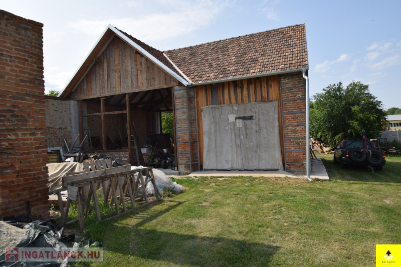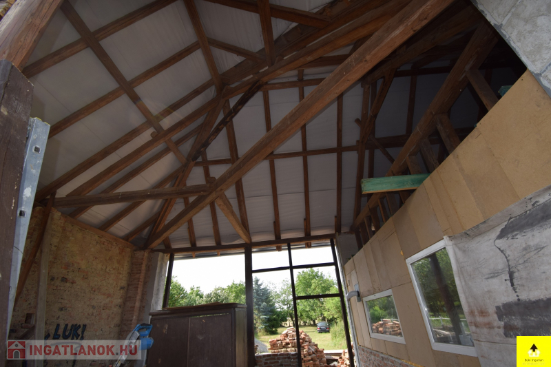 A harmadik és talán a legérdekesebb épület egy 200 m2 alapterületű rendkívül masszív pajta épület, amelynek jelenleg a fele felett van tető. A pillérek állnak és az eredeti elképzelés szerint egy nyitott szín lett volna, de természetesen ez másképp is kivitelezhető. Mivel a térképen az eredeti 200 m2 szerepel ez mindenféle engedély nélkül megoldható. A pajta belmagassága 4 méter !! így akár raktározási célokra is kiválóan alkalmas lehet, de lakóházzá is alakítható. A pajta betongerendával körbe van vasalva és 20 cm vastag Fiber erősítéssel ellátott aljzatbetont kapott így rendkívül erős és masszív lett. Nagy gépek, teherautók, vagy nehéz dolgok tárolására is kiválóan alkalmas lehet. Az épületben egy 45 m2 -es fűthető részben hőszigetelt "pajta műhely" lett kialakítva amely fűthető részben hőszigetelt és könnyűszerkezetes falazattal rendelkezik. A pajta tetőterét pedig szintén többféleképpen hasznosíthatjuk hatalmas méretlének köszönhetően. Lehet tágas lakás, raktár vagy műterem, de hagyhatjuk így nyitottan is az óriási belmagasságának köszönhetően galériásan is.